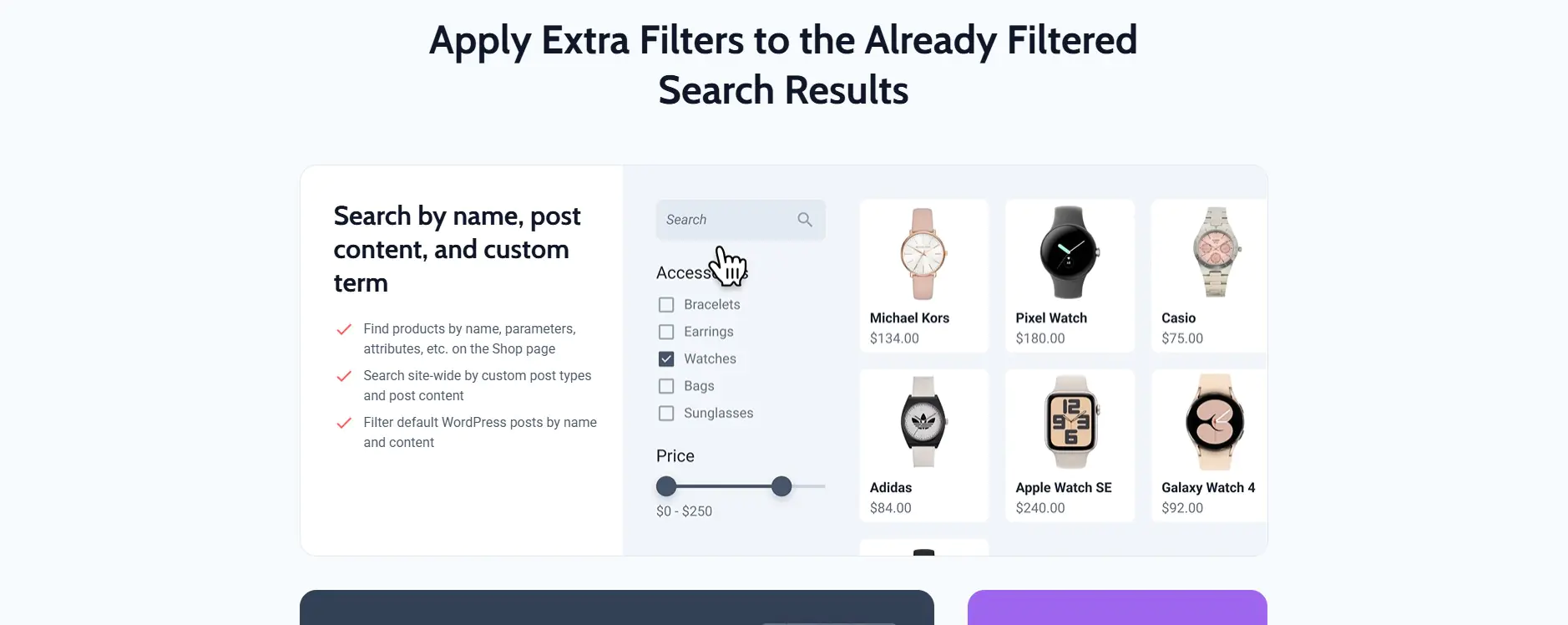 Với 7 kiểu lọc thông minh khác nhau, bạn có thể dễ dàng áp dụng cho WooCommerce products, custom posts hoặc taxonomy terms, mang đến trải nghiệm tìm kiếm mượt mà và tiện lợi hơn bao giờ hết.