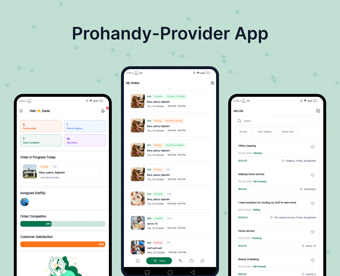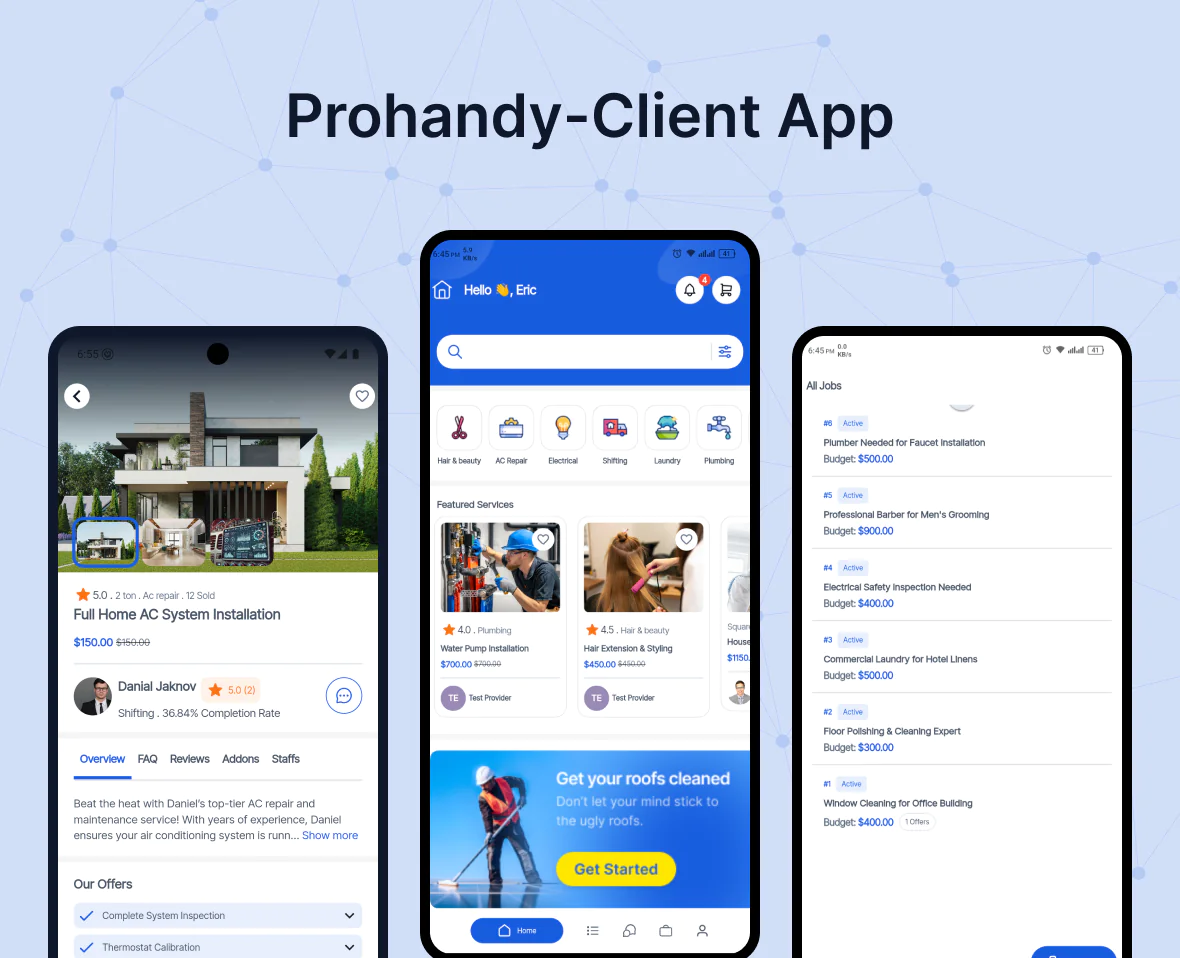 Prohandy được tối ưu cho cả thiết bị iOS và Android, giúp người dùng đặt dịch vụ và quản lý công việc một cách nhanh chóng, tiện lợi và hiệu quả. Đây là lựa chọn lý tưởng cho các startup và doanh nghiệp muốn xây dựng một hệ sinh thái dịch vụ linh hoạt, hiện đại.