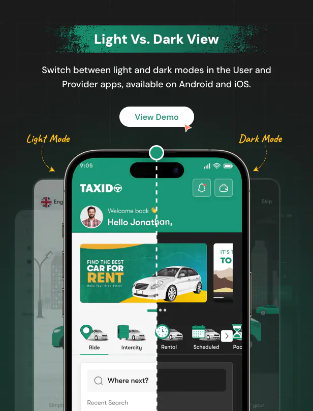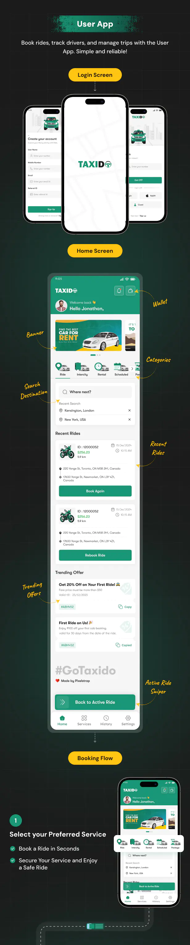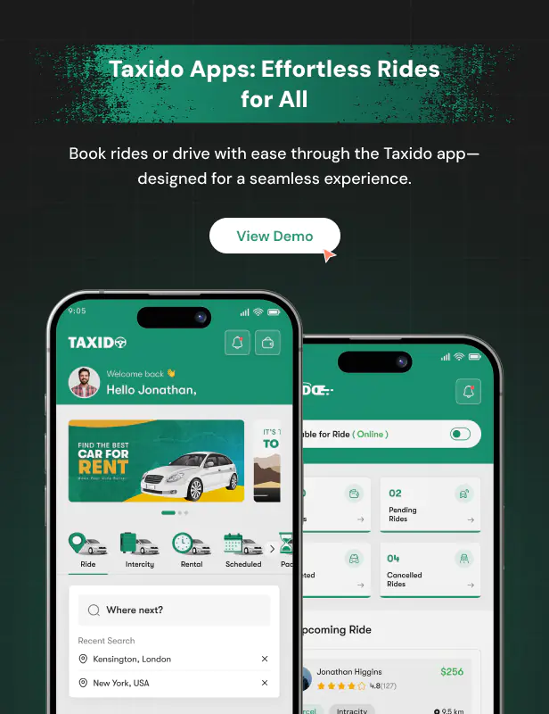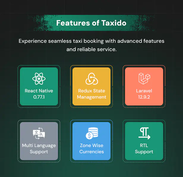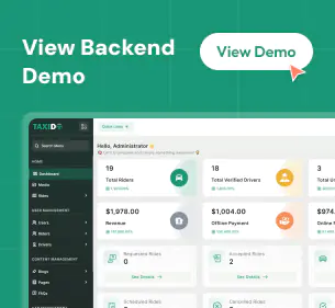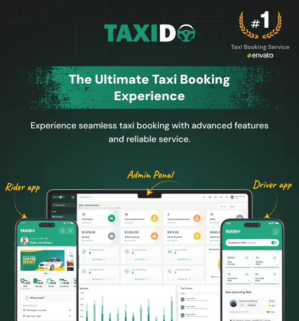 Taxido là giải pháp hoàn chỉnh cho dịch vụ đặt xe taxi, được xây dựng bằng công nghệ Laravel cho backend và React Native cho ứng dụng di động. Ứng dụng này mang đến trải nghiệm người dùng mượt mà và hiệu quả cho cả khách hàng và tài xế.
